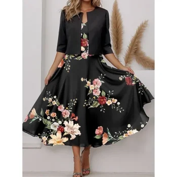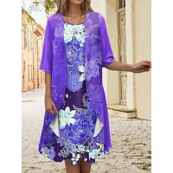 Women’s Casual Dress Dress Set Two Piece Dress Long Dress Maxi Dress Purple Brown Green Half Sleeve Flower Print Summer Spring V Neck Fashion Vacation S M L XL XXL 3XL