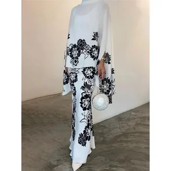 Women’s Two Piece Dress Set Casual Dress Skirt Set Daily Going out Elegant Modern Ruffle Print Long Dress Maxi Dress Stand Collar Long Sleeve Floral Regular Fit White Champagne Wine Fall Winter S M L