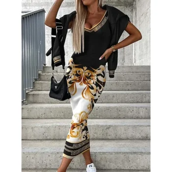 Women’s Two Piece Dress Set Casual Dress Skirt Set Outdoor Daily Fashion Streetwear Print Midi Dress V Neck Long Sleeve Floral Geometric Loose Fit Black White Yellow Fall Winter S M L XL XXL