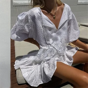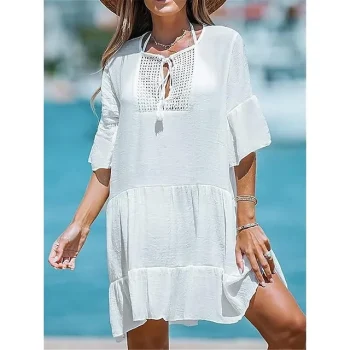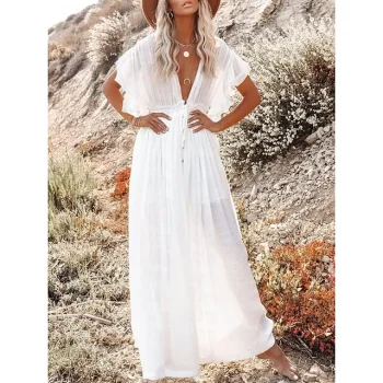 Women’s Casual Dress Swing Dress White Dress Long Dress Maxi Dress Ruffle Backless Vacation Beach Bohemia Maxi V Neck Short Sleeve Loose Fit White Royal Blue Army Green Color One-Size Size
