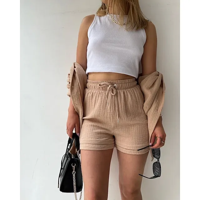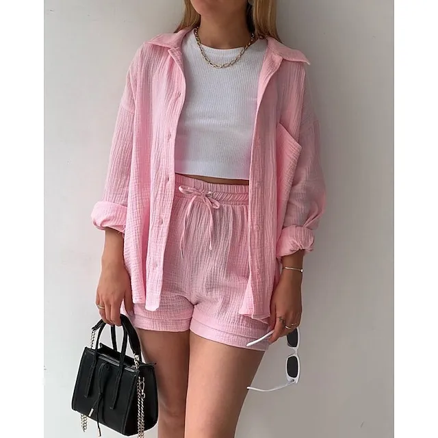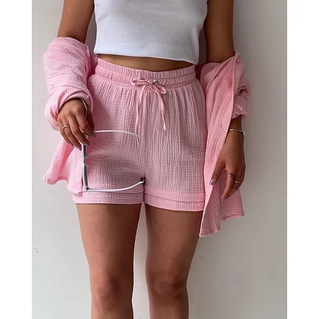 Linen Set Shirt Set Women’s Pink Purple Fuchsia Solid Color Drawstring 2 Piece Street Daily Fashion Shirt Collar Cotton Linen Regular Fit S