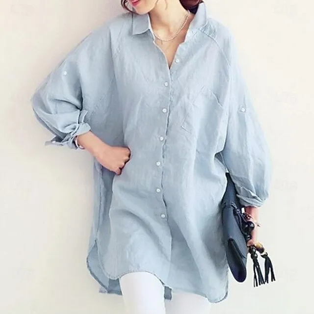 Linen Shirt Shirt Tunic Shirts Blouse Women's White Light Blue Solid Color Button Pocket Street Daily Fashion Shirt Collar Cotton Linen Regular Fit S