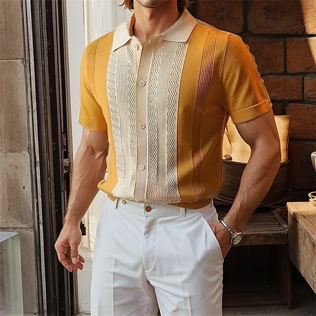 Men’s Knit Polo Casual Holiday Lapel Button Short Sleeve Fashion Modern Color Block Button Summer Black Yellow Knit Polo