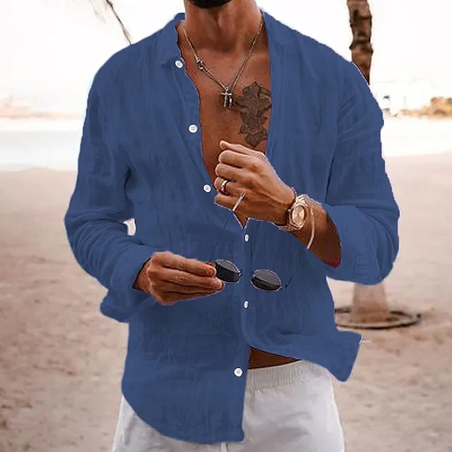 Men’s Linen Shirt Casual Shirt Summer Shirt Beach Shirt Black White Pink Long Sleeve Plain Lapel Spring & Summer Hawaiian Holiday Clothing Apparel Basic