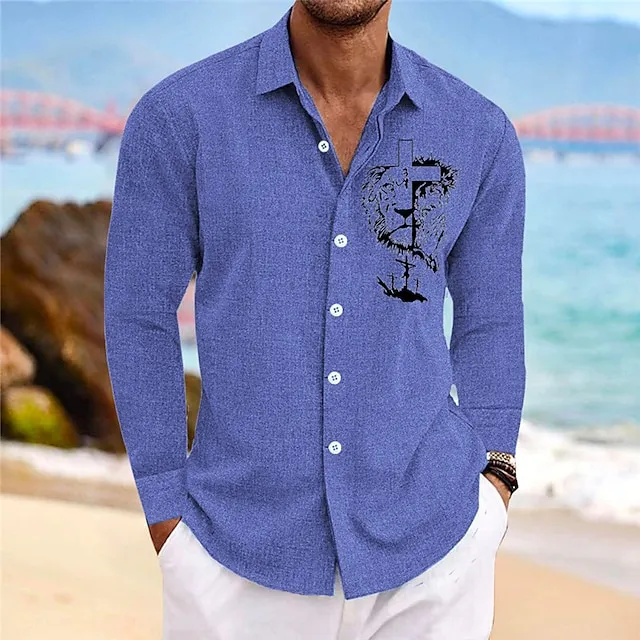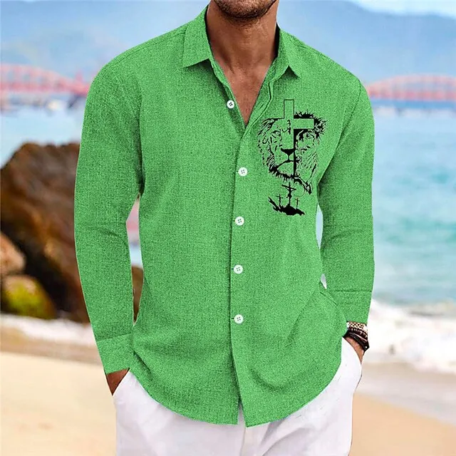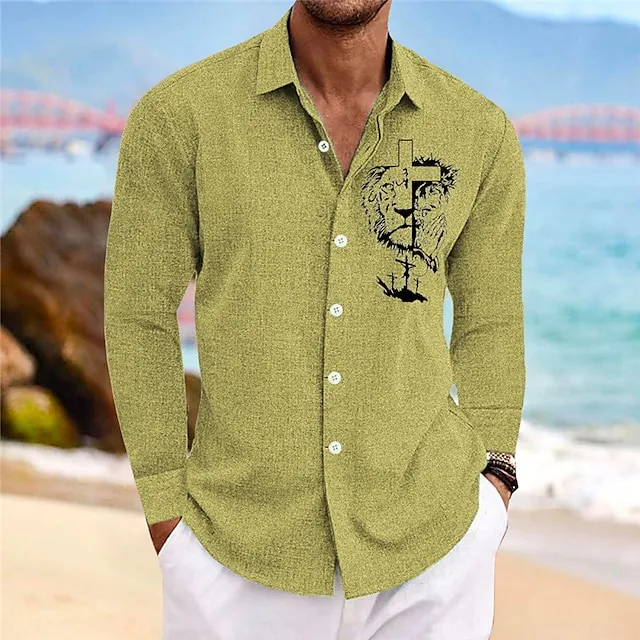Men’s Shirt Lion GraphicCross Turndown Yellow Blue Green Gray Outdoor Street Long Sleeve Print Clothing Apparel Fashion Streetwear Designer Casual