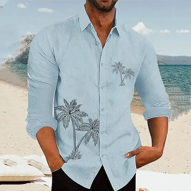 Palm Tree Casual Men’s Shirt Linen Shirt Outdoor Daily Vacation Spring & Fall Lapel Long Sleeve White, Blue, Gray S, M, L Polyester Shirt