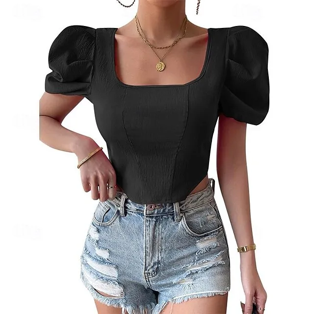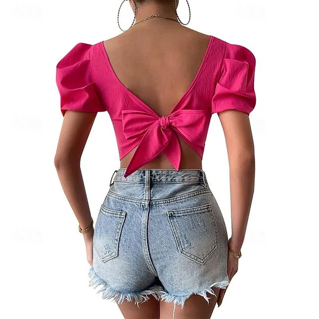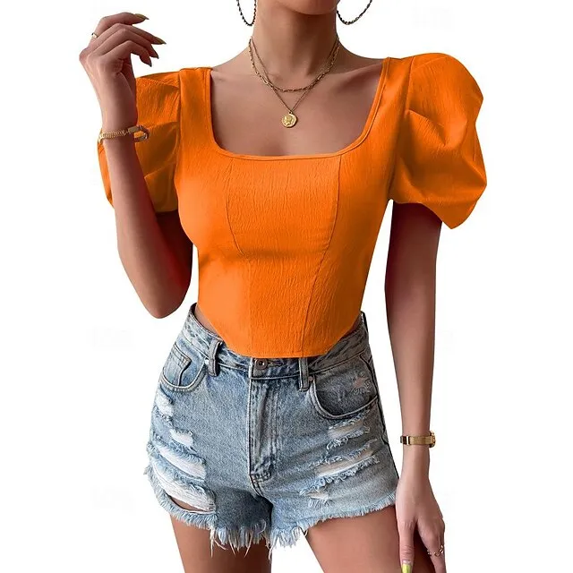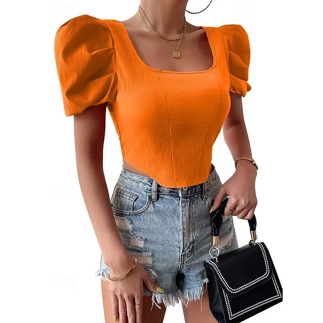 Shirt Blouse Women’s Black Fuchsia Orange Solid Color Open Back Street Daily Fashion Square Neck S