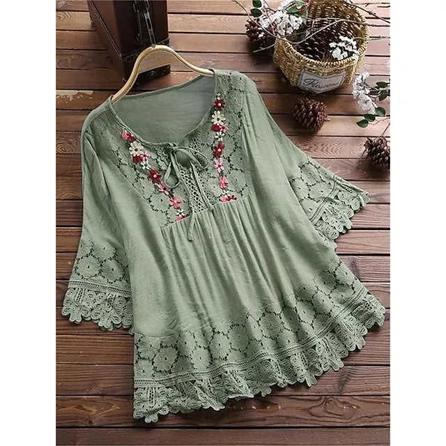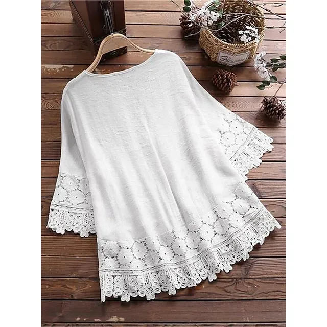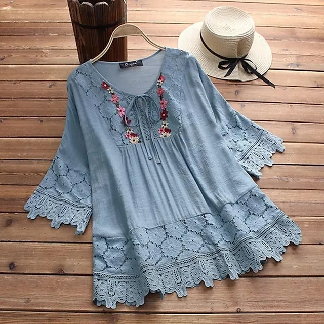 Shirt Blouse Women’s White Pink Blue Floral Lace up Lace Street Daily Fashion Round Neck S