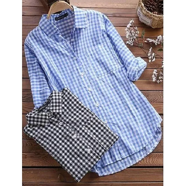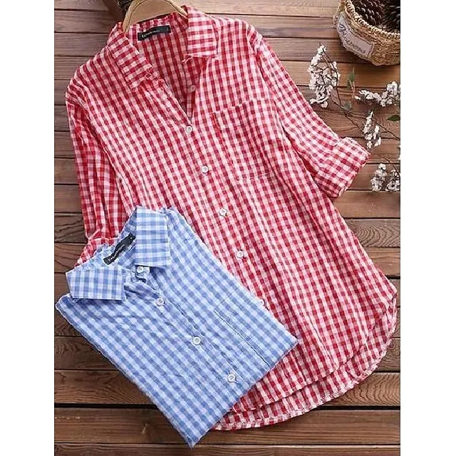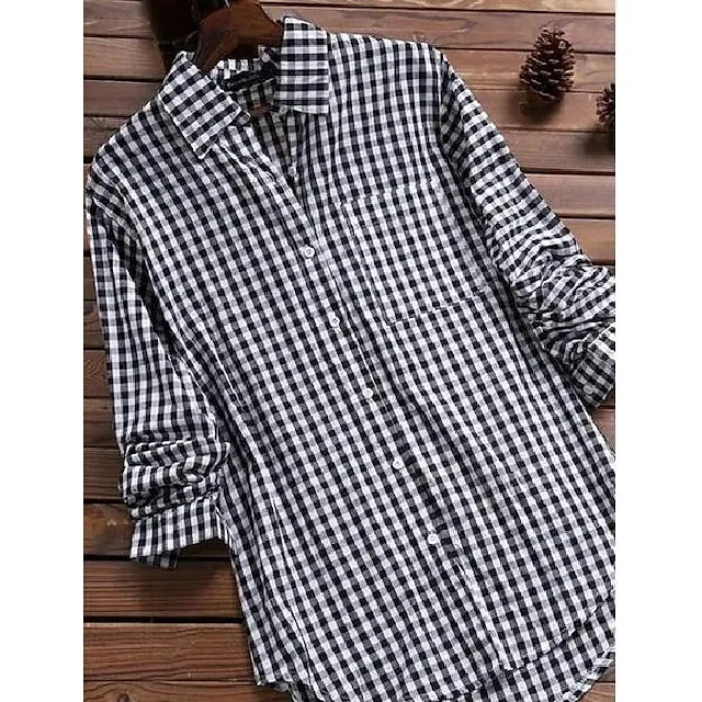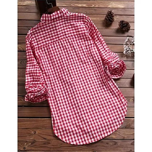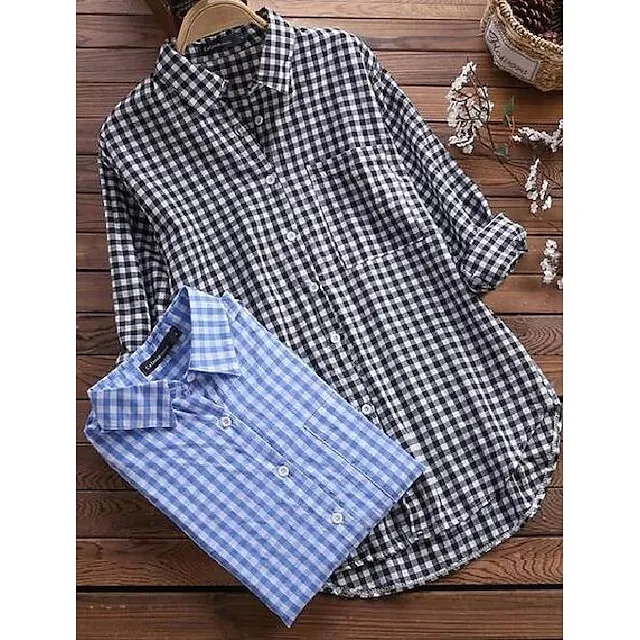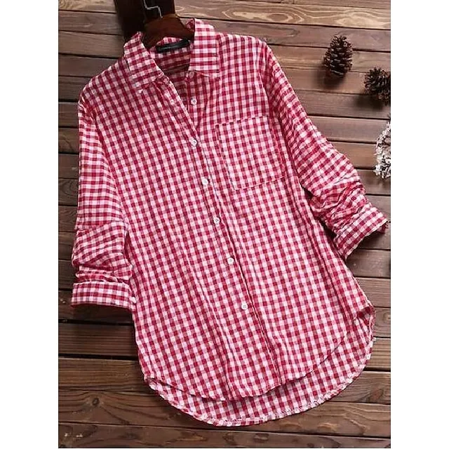 Shirt Women's Black Red Blue Plaid Pocket Daily Basic Shirt Collar Regular Fit S