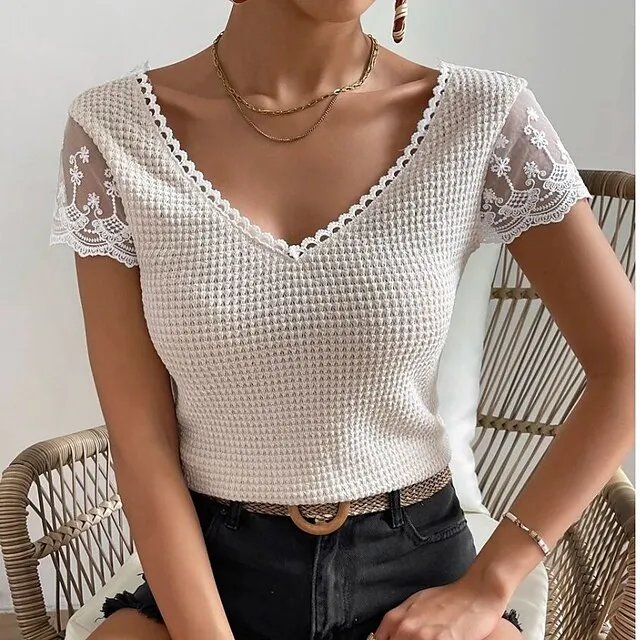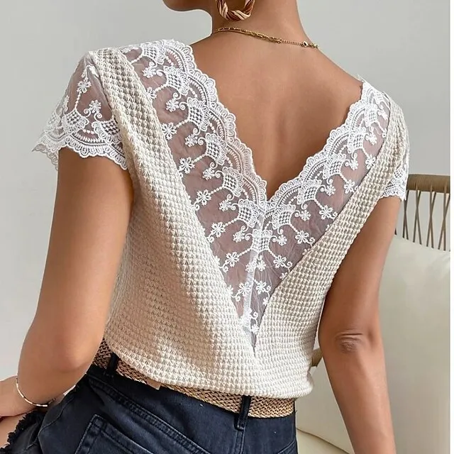 T shirt Tee Women's Beige Plain Lace Patchwork Casual Weekend Fashion V Neck Regular Fit S