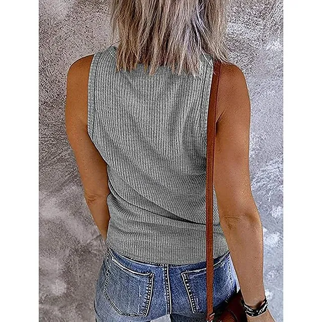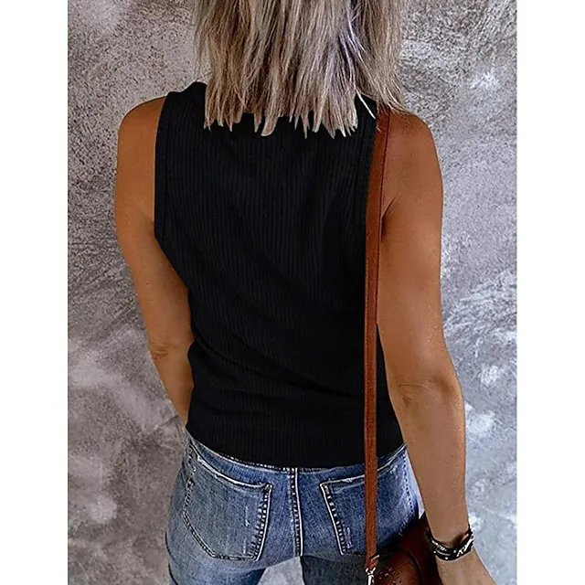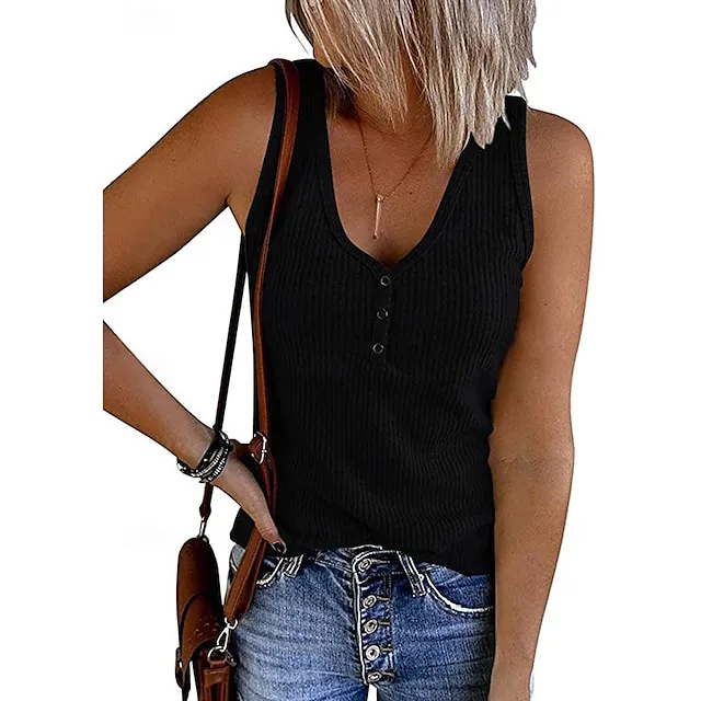 Tank Women’s Black Wine Navy Blue Solid Color Button Street Daily Fashion V Neck S