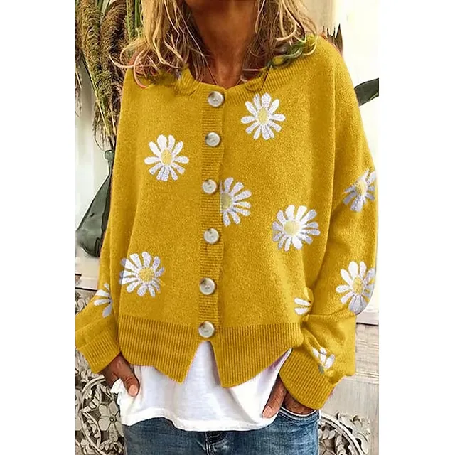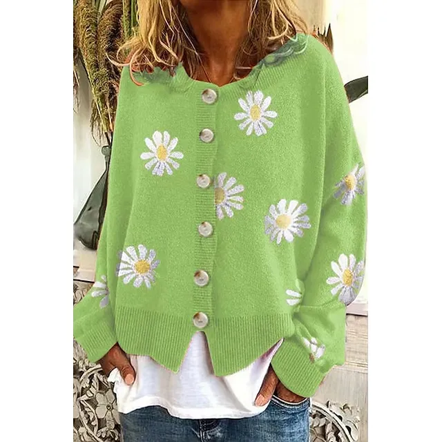 Women’s Cardigan Knitted Button Print Floral Daisy Stylish Basic Casual Long Sleeve Regular Fit Sweater Cardigans Open Front Fall Winter Spring Blue Black Gray / Going out