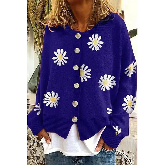 Women's Cardigan Knitted Button Print Floral Daisy Stylish Basic Casual Long Sleeve Regular Fit Sweater Cardigans Open Front Fall Winter Spring Blue Black Gray / Going out