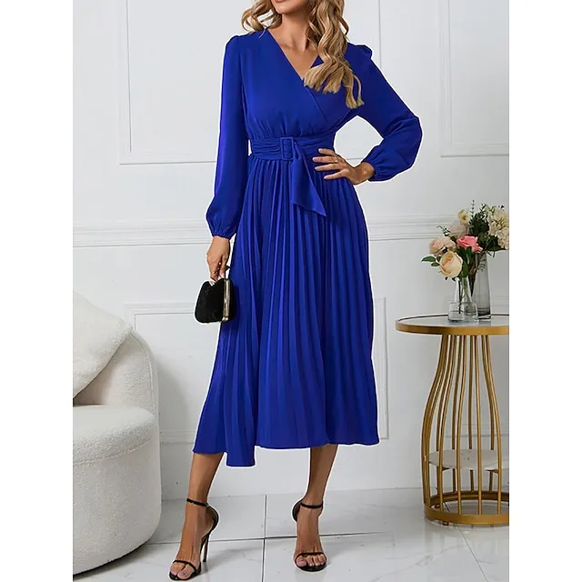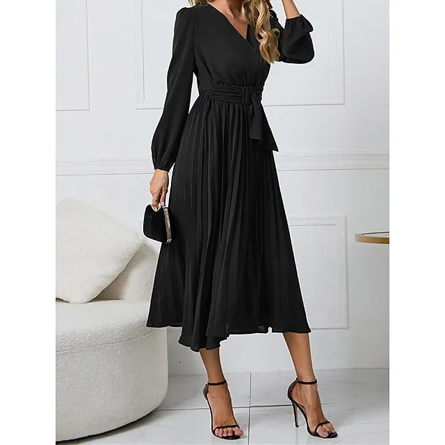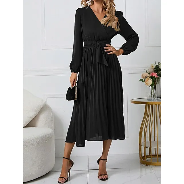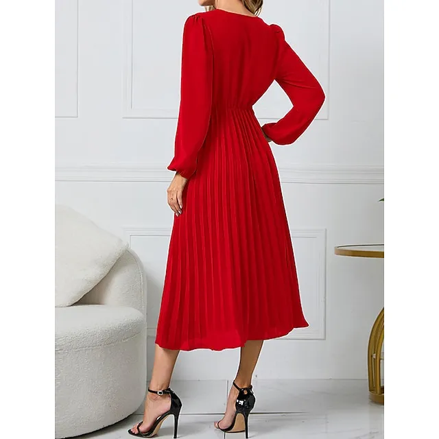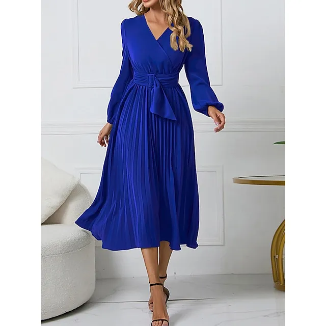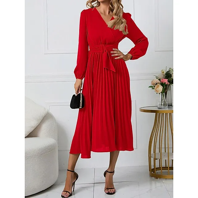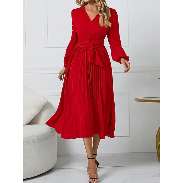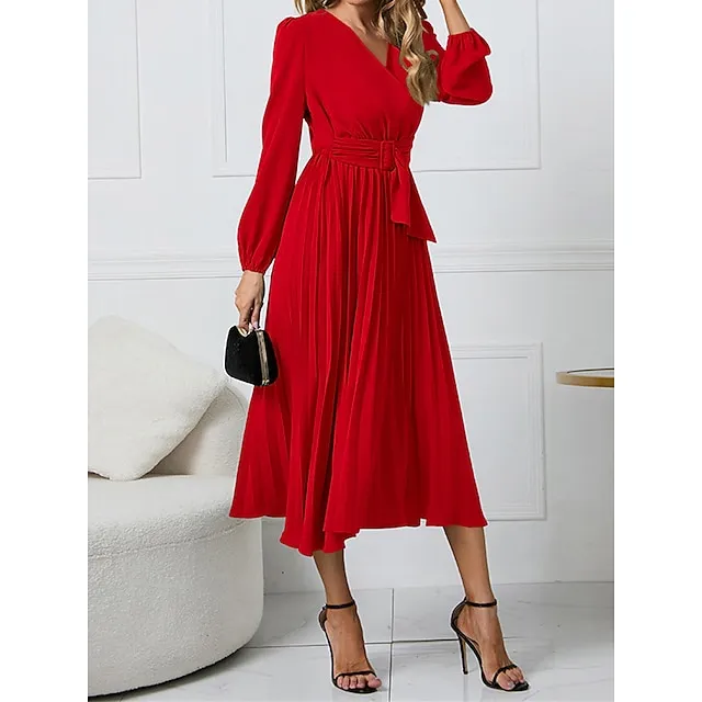 Women’s Casual Dress Plain Dress Midi Dress Lace up Pleated Outdoor Street Daily Fashion Streetwear V Neck Long Sleeve Regular Fit Black Red Navy Blue Color S M L XL XXL Size