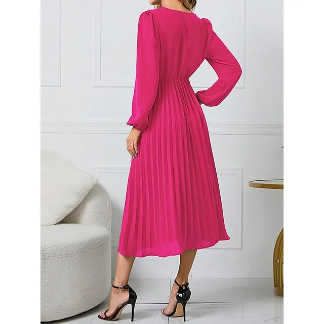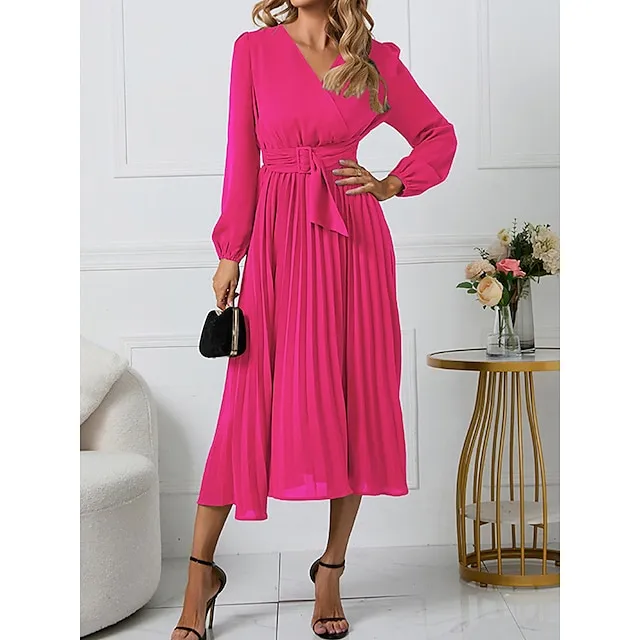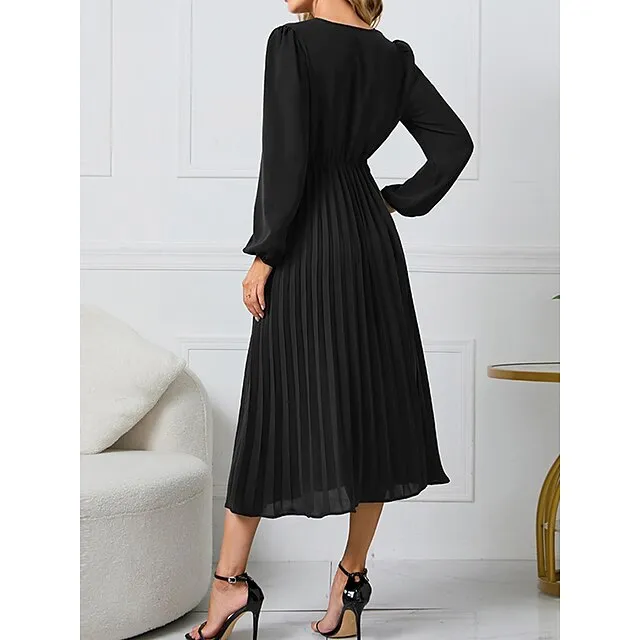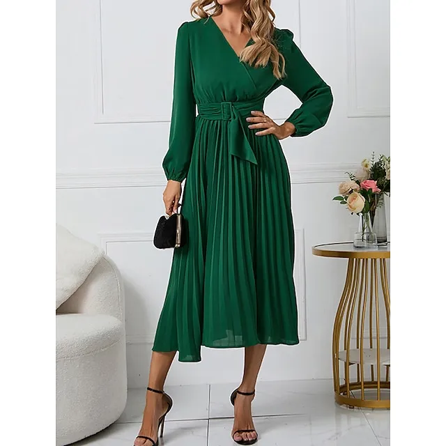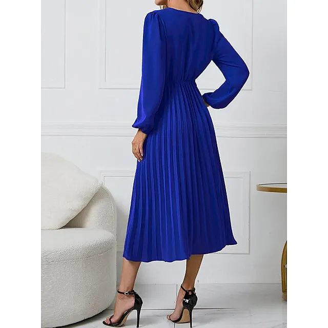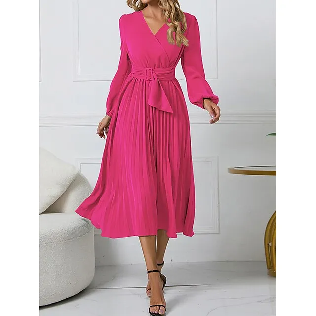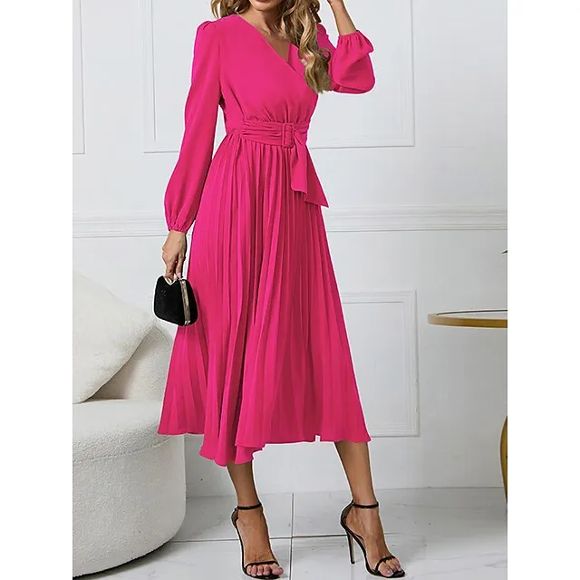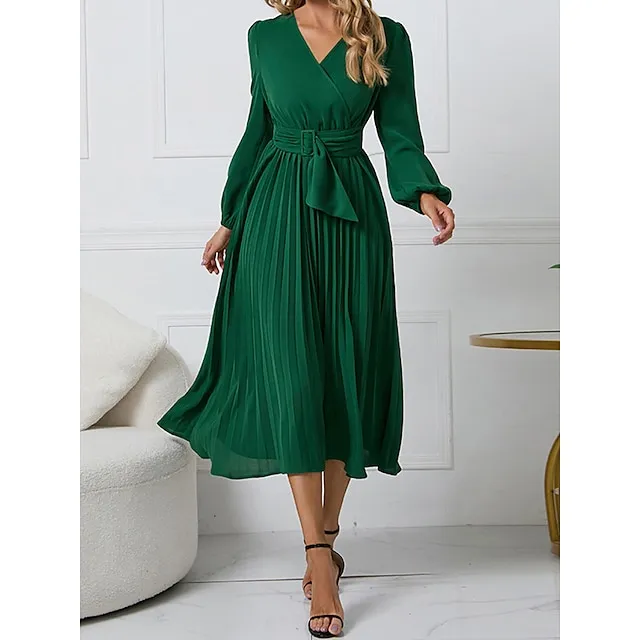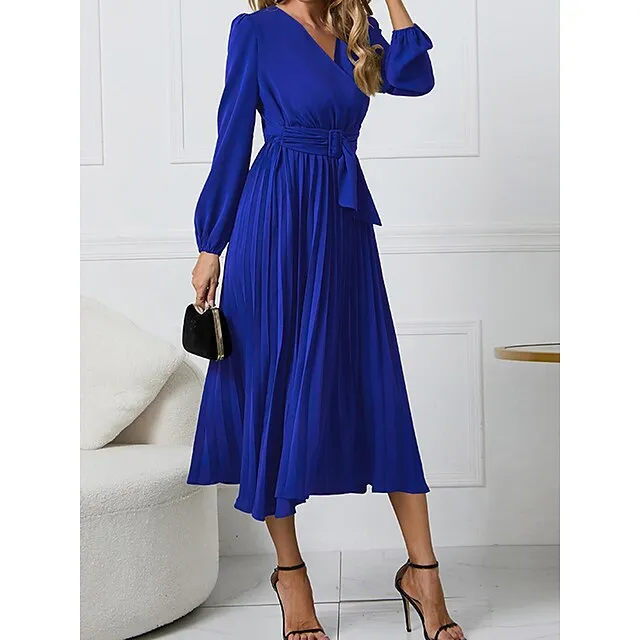 Women’s Casual Dress Plain Dress Midi Dress Lace up Pleated Outdoor Street Daily Fashion Streetwear V Neck Long Sleeve Regular Fit Black Red Navy Blue Color S M L XL XXL Size