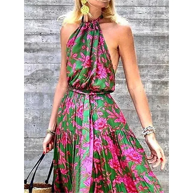 Women's Casual Dress Swing Dress Floral Print Halter Neck Long Dress Maxi Dress Streetwear Maxi Street Holiday Sleeveless Regular Fit Green Summer S M L XL 2XL