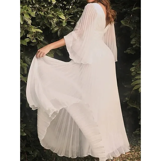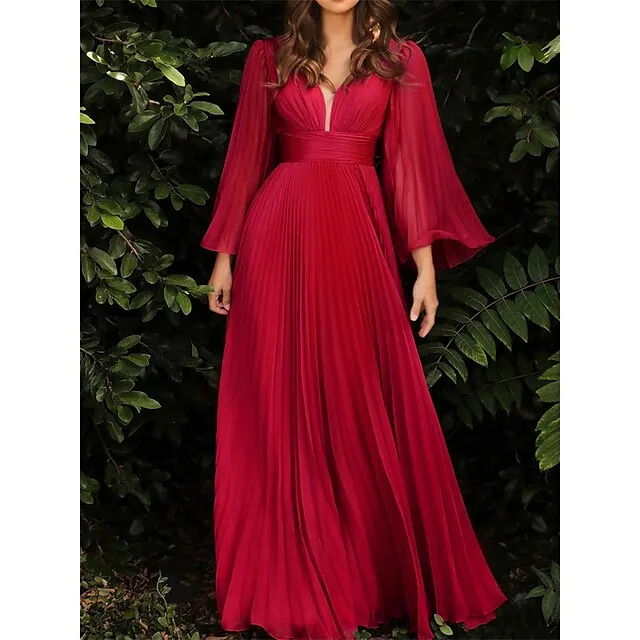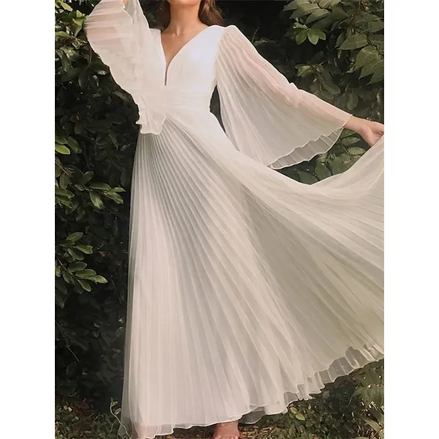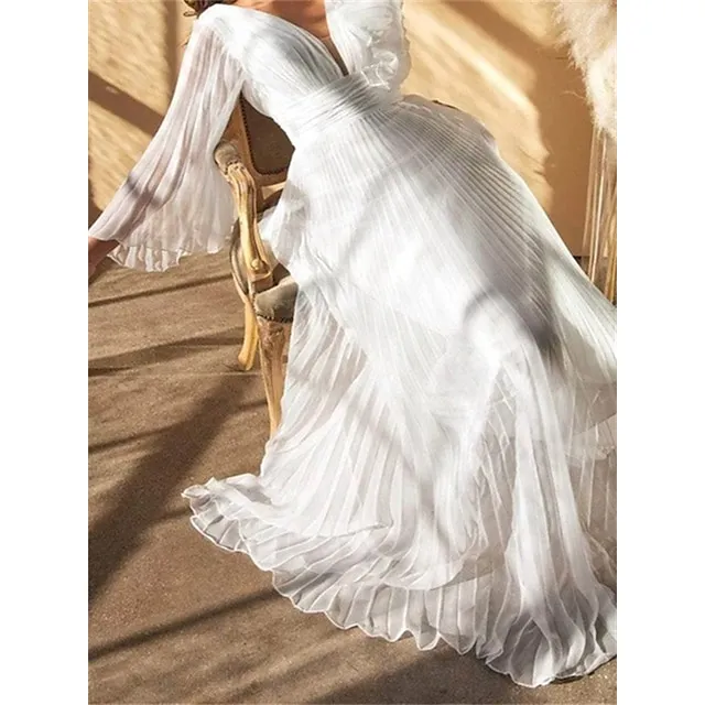 Women’s Prom Dress Party Dress Holiday Dress Long Dress Maxi Dress White Wine Long Sleeve Pure Color Pleated Spring Fall Winter V Neck Fashion Vacation Spring Dress S M L XL