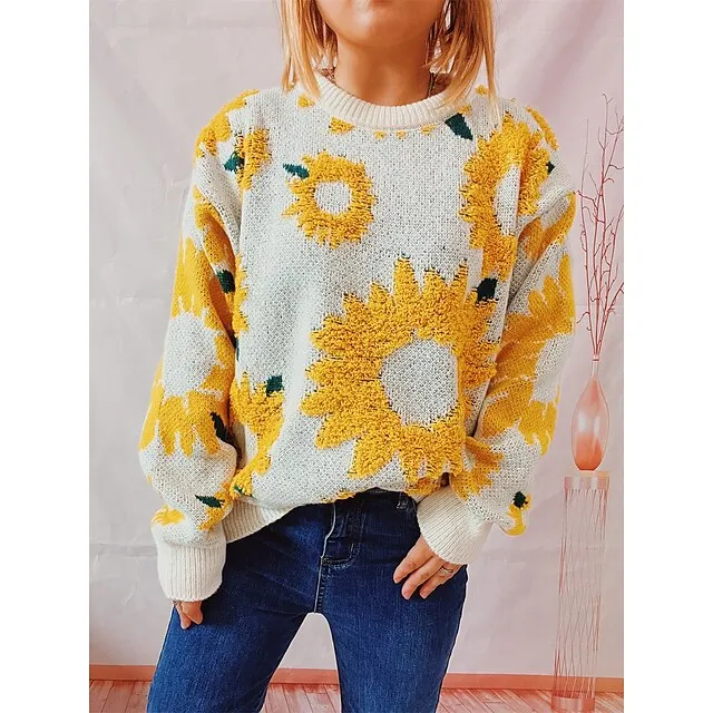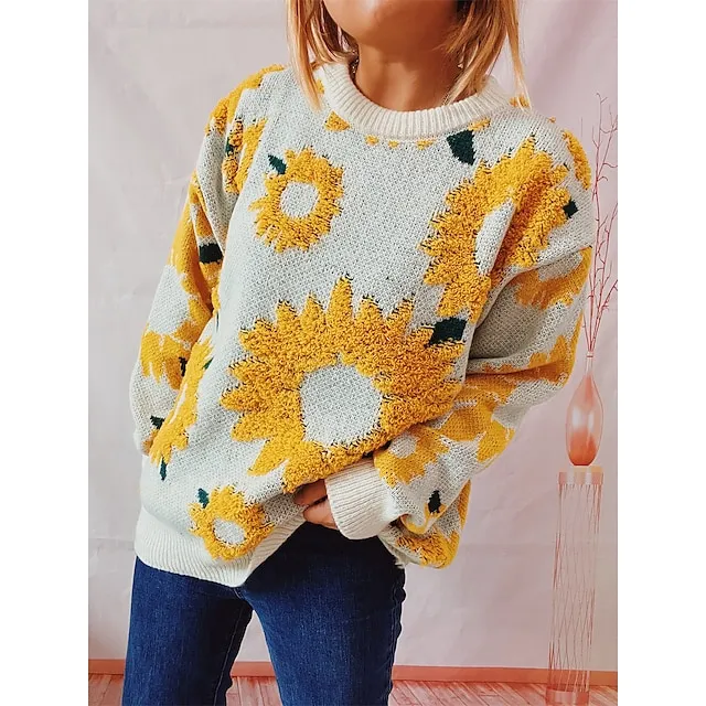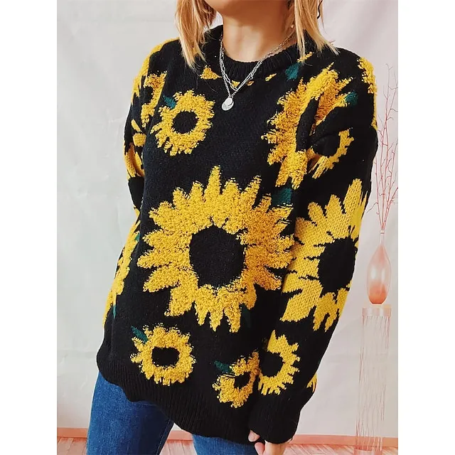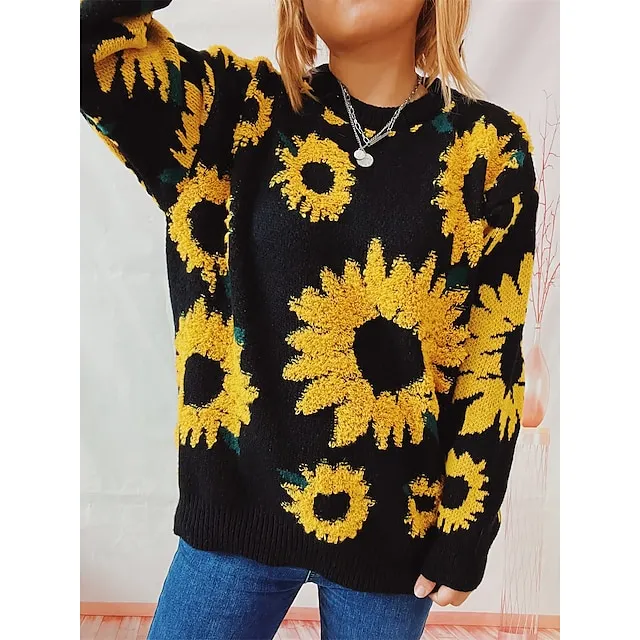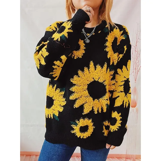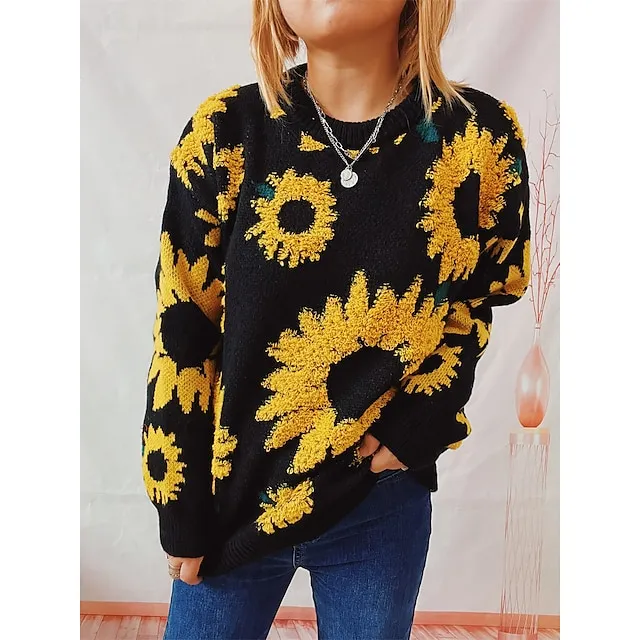 Women's Pullover Sweater Jumper Crew Neck Chunky Knit Polyester Embroidery Spring Fall Winter Regular Daily Holiday Valentine Stylish Casual Long Sleeve Floral Black Yellow S M L