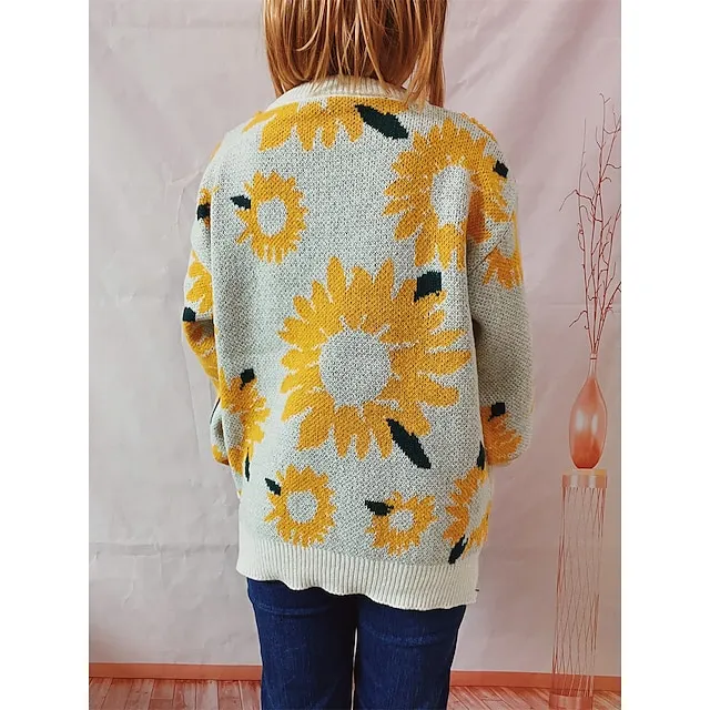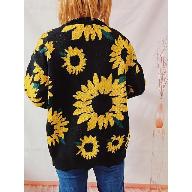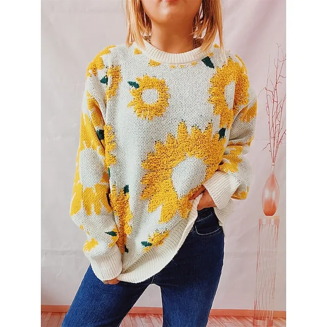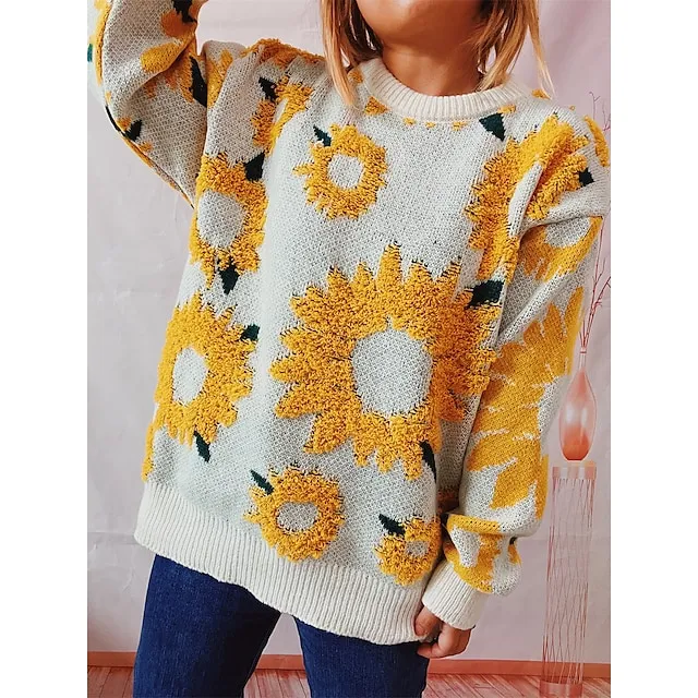 Women’s Pullover Sweater Jumper Crew Neck Chunky Knit Polyester Embroidery Spring Fall Winter Regular Daily Holiday Valentine Stylish Casual Long Sleeve Floral Black Yellow S M L