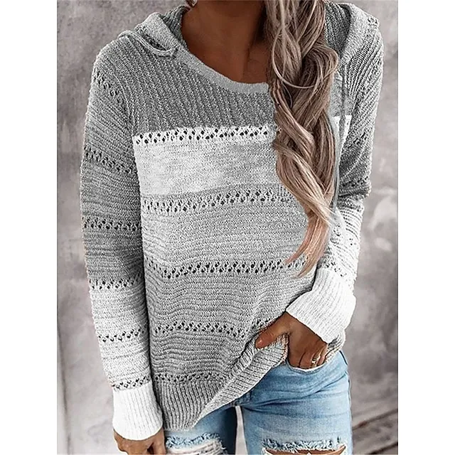 Women’s Pullover Sweater Jumper Hooded Ribbed Knit Polyester Patchwork Hole Fall Winter Regular Daily Going out Weekend Stylish Casual Soft Long Sleeve Striped Pink Blue Purple S M L