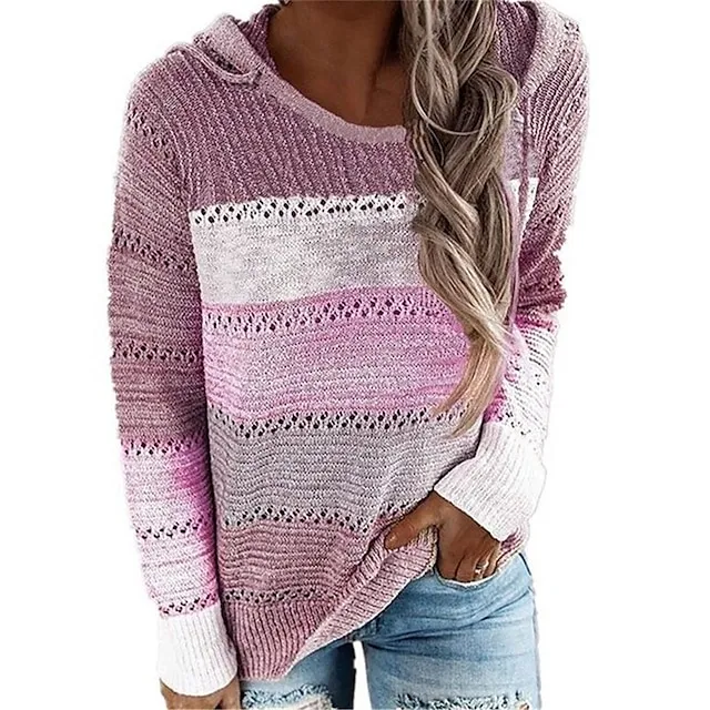 Women's Pullover Sweater Jumper Hooded Ribbed Knit Polyester Patchwork Hole Fall Winter Regular Daily Going out Weekend Stylish Casual Soft Long Sleeve Striped Pink Blue Purple S M L