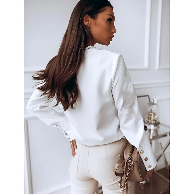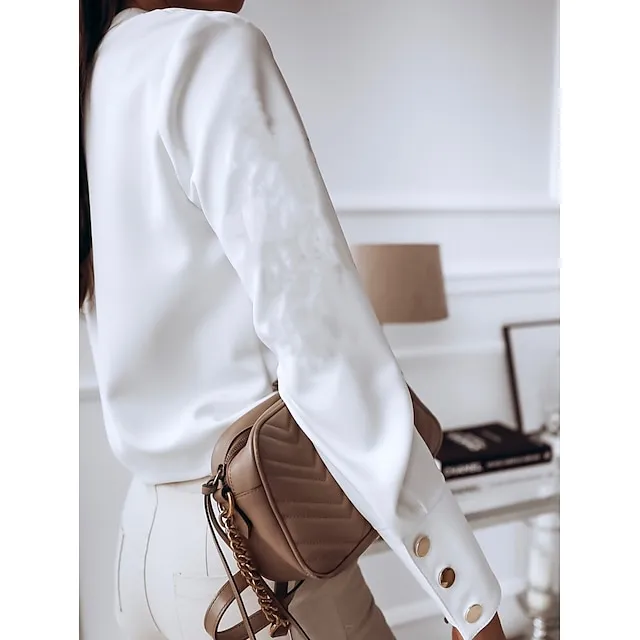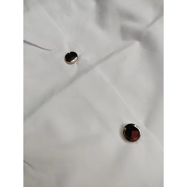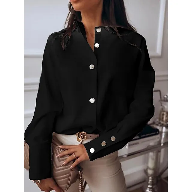 Women's Shirt Blouse Black White Button Long Sleeve Work Business Standing Collar S