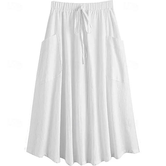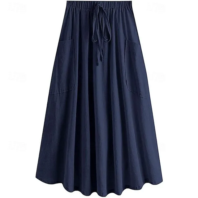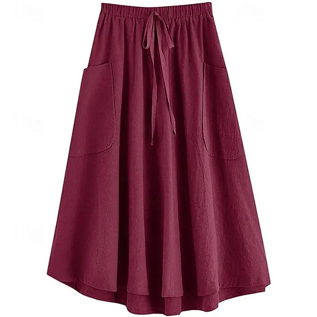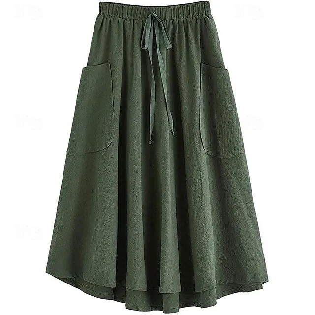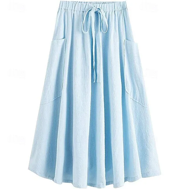 Women's Skirt Swing Midi Cotton Linen Wine Black Army Green Sky Blue Skirts Summer Pocket Drawstring High Waist Basic Casual Casual Daily Weekend XS S M