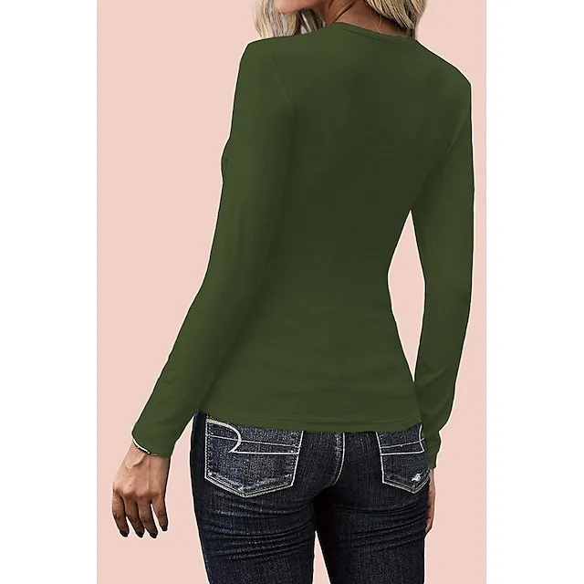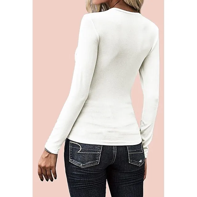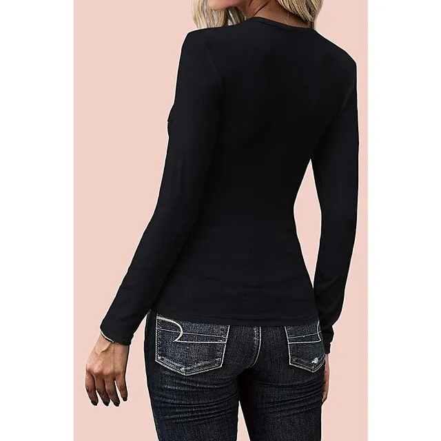 Women's T shirt Tee Black White Wine Plain Button Long Sleeve Daily Weekend Basic U Neck Regular Slim S