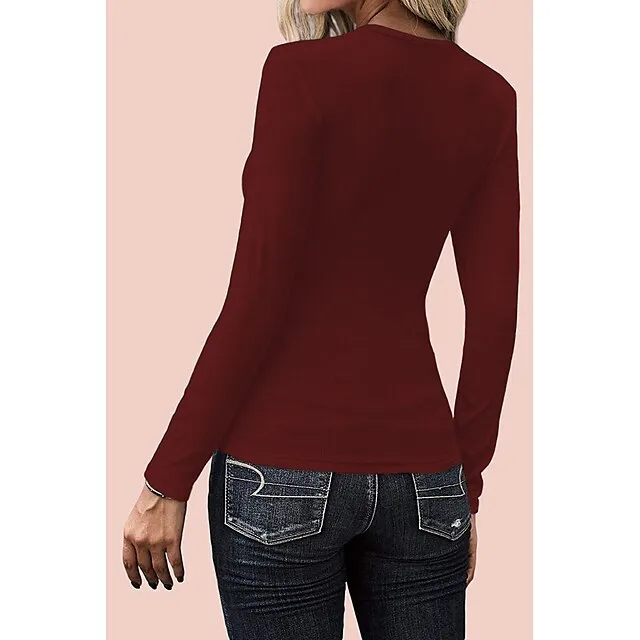 Women’s T shirt Tee Black White Wine Plain Button Long Sleeve Daily Weekend Basic U Neck Regular Slim S