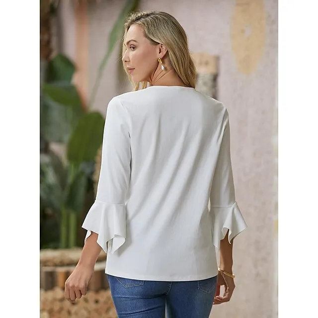 Women's T shirt Tee Plain Daily Weekend Flare Cuff Sleeve White Pink Blue 3/4 Length Sleeve Basic V Neck Regular Fit