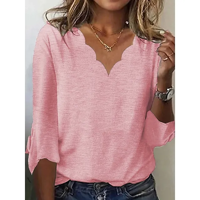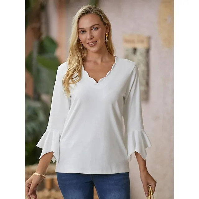 Women’s T shirt Tee Plain Daily Weekend Flare Cuff Sleeve White Pink Blue 3/4 Length Sleeve Basic V Neck Regular Fit