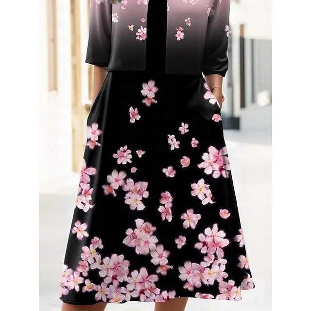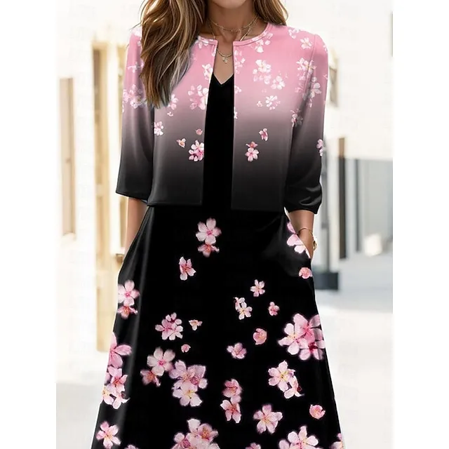 Women’s Two Piece Dress Set Casual Dress Swing Dress Outdoor Holiday Elegant Fashion Print Midi Dress V Neck Half Sleeve Floral Regular Fit Pink Summer Spring S M L XL XXL