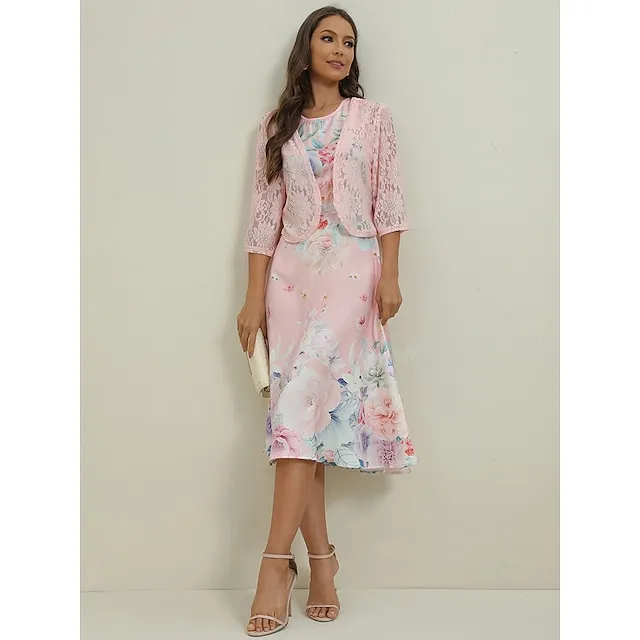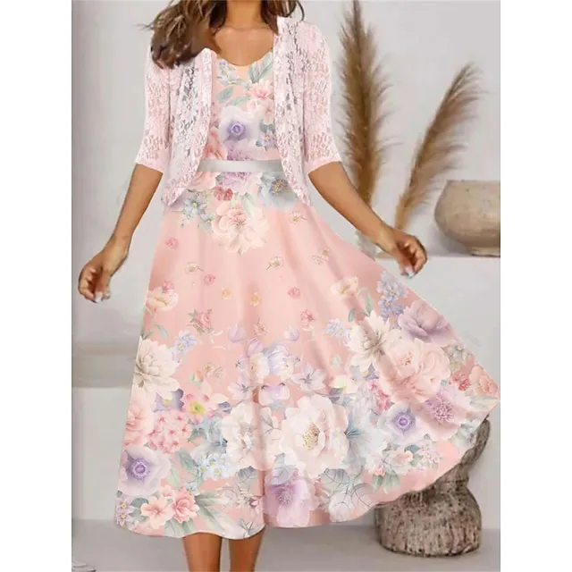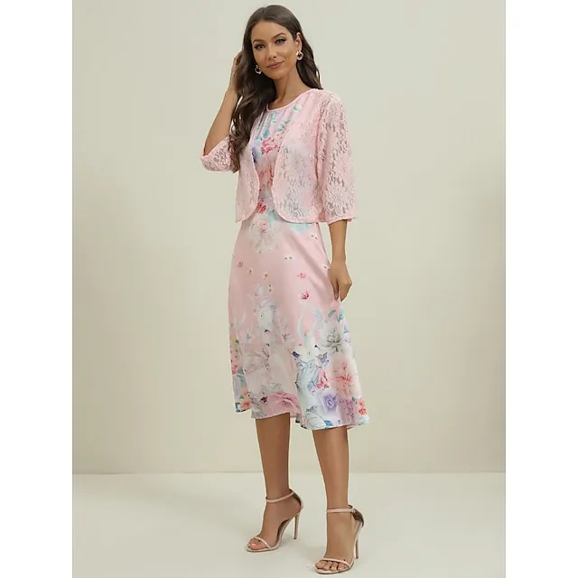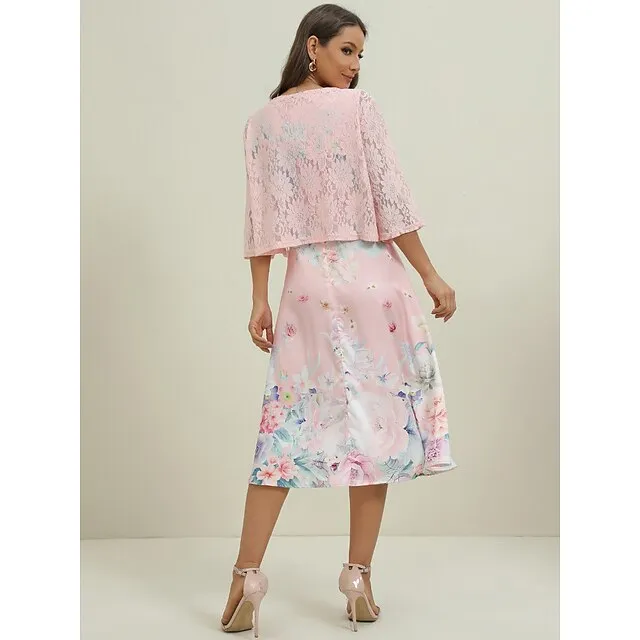 Women’s Two Piece Dress Set Party Dress Lace Dress Party Wedding Guest Elegant Fashion Print Lace Midi Dress V Neck Half Sleeve Floral Regular Fit Pink Fall Winter S M L XL XXL