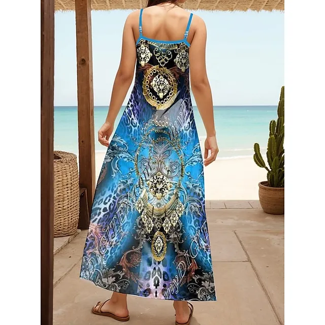Women’s Vintage Dress Casual Dress Floral Backless Print Strap Long Dress Maxi Dress Ethnic Tribal Street Vacation Sleeveless Regular Fit Blue Summer S M L XL XXL