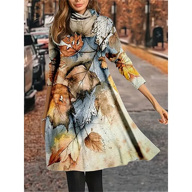 Women's Winter Dress Print Dress Leaf Plaid Print Turtleneck Midi Dress Fashion Streetwear Outdoor Street 3/4 Length Sleeve Loose Fit Red Dark Green Green Fall Winter S M L XL XXL