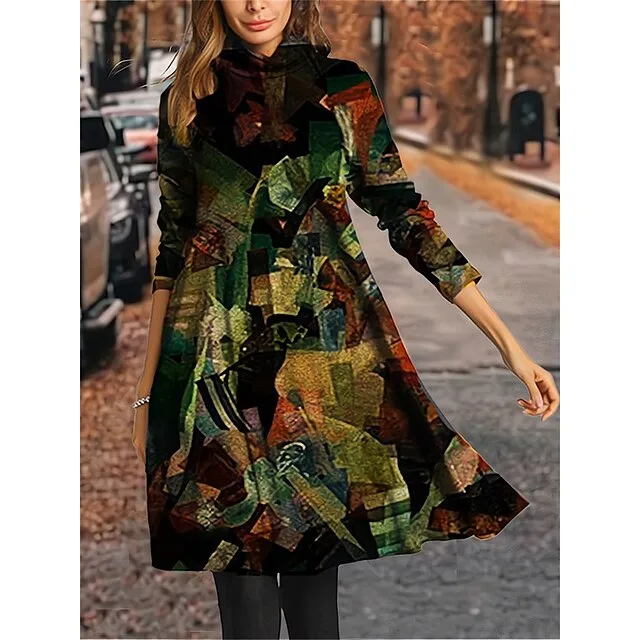 Women’s Winter Dress Print Dress Leaf Plaid Print Turtleneck Midi Dress Fashion Streetwear Outdoor Street 3/4 Length Sleeve Loose Fit Red Dark Green Green Fall Winter S M L XL XXL