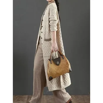 Women’s Cardigan Sweater Stand Collar Cable Knit Polyester Button Pocket Fall Winter Long Outdoor Daily Going out Vintage Style Casual Soft Long Sleeve Solid Color Black Beige Coffee One-Size