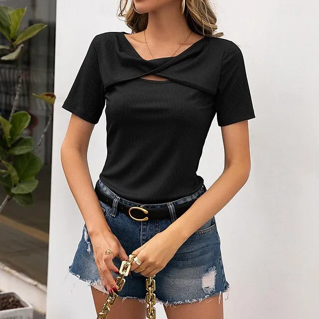 T shirt Tee Women's Black White Blue Solid Color Cut Out Street Daily Fashion Round Neck S