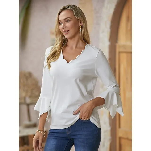 Women's T shirt Tee Plain Daily Weekend Flare Cuff Sleeve White Pink Blue 3/4 Length Sleeve Basic V Neck Regular Fit