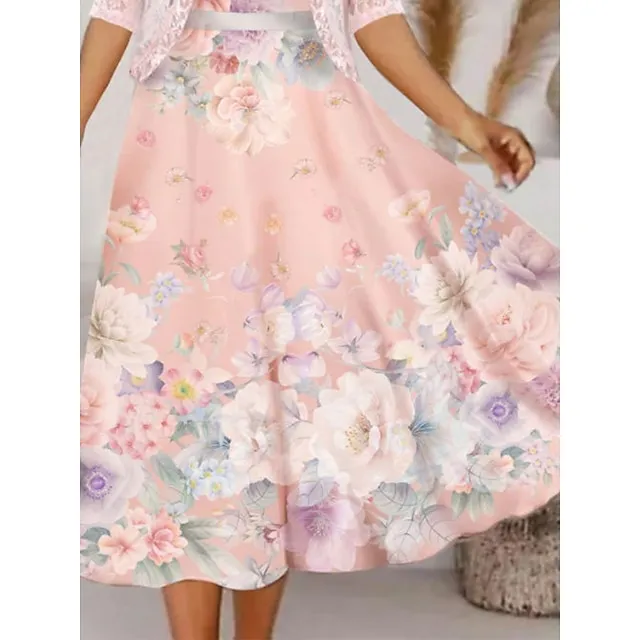 Women’s Two Piece Dress Set Party Dress Lace Dress Party Wedding Guest Elegant Fashion Print Lace Midi Dress V Neck Half Sleeve Floral Regular Fit Pink Fall Winter S M L XL XXL