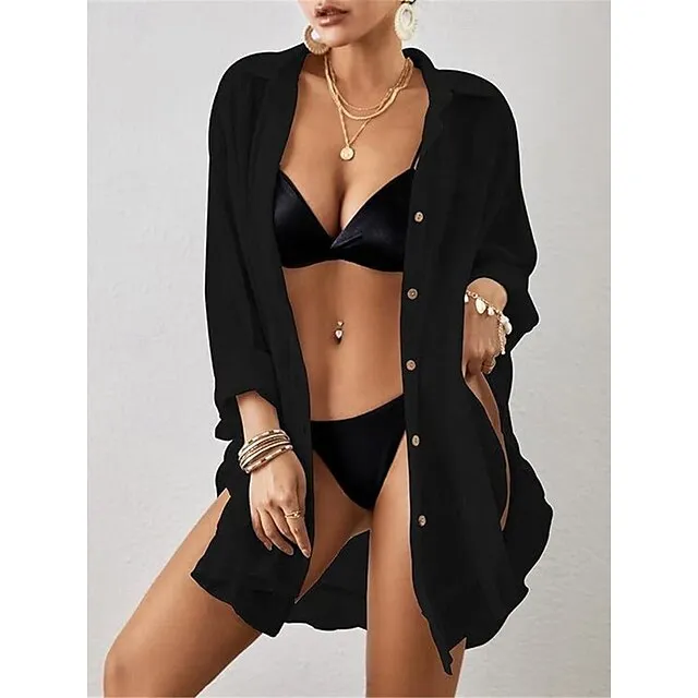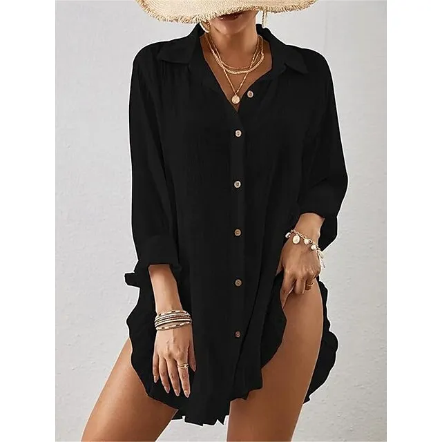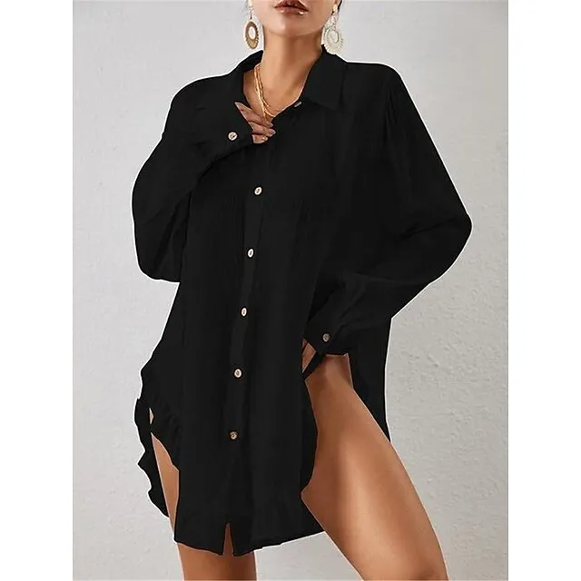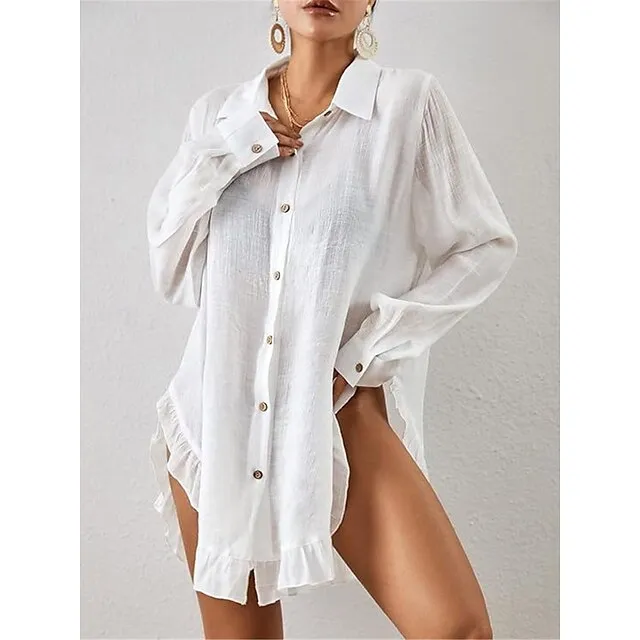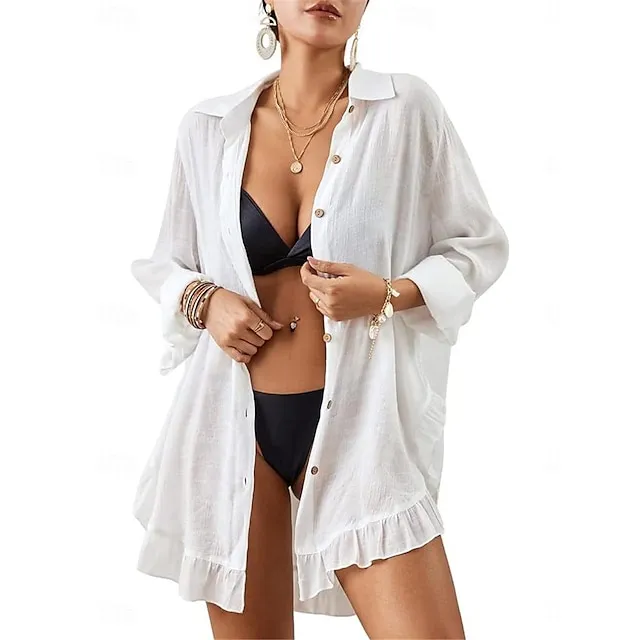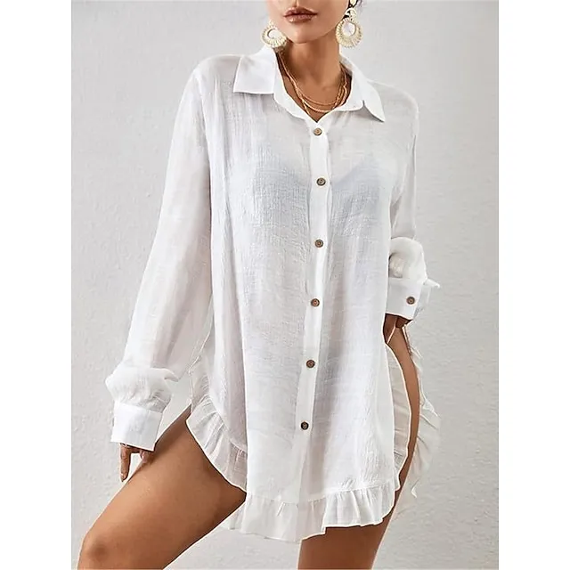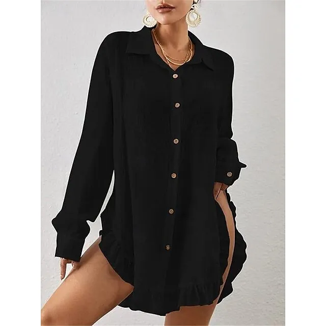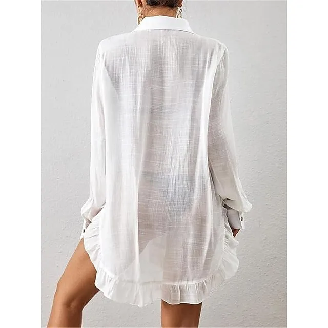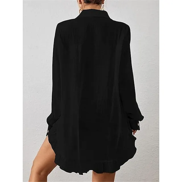 Women’s White Dress Casual Dress Summer Dress Mini Dress Ruffle Button Holiday Vacation Beach Basic Shirt Collar Long Sleeve Loose Fit Black White Color S M L XL 2XL Size