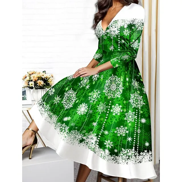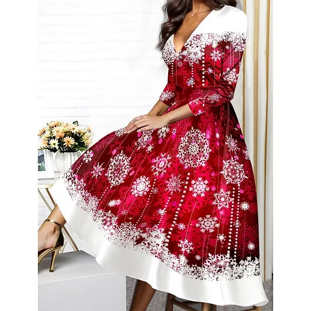 Women’s Winter Dress Swing Dress Snowflake Print V Neck Midi Dress Fashion Streetwear Outdoor Daily 3/4 Length Sleeve Regular Fit Red Blue Green Fall Winter S M L XL XXL